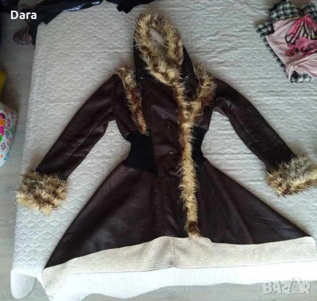 Кафяво асиметрично яке с втален силует с дълъг косъм - 35лв.