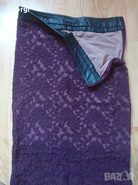 Дантелена права пола в тъмнон вишнев цвят.Отгоре колана е кожа и отстрани се закопчава с цип.Не прозира,има хастар! Размер S/M. Обличана е само два пъти!!!