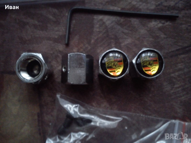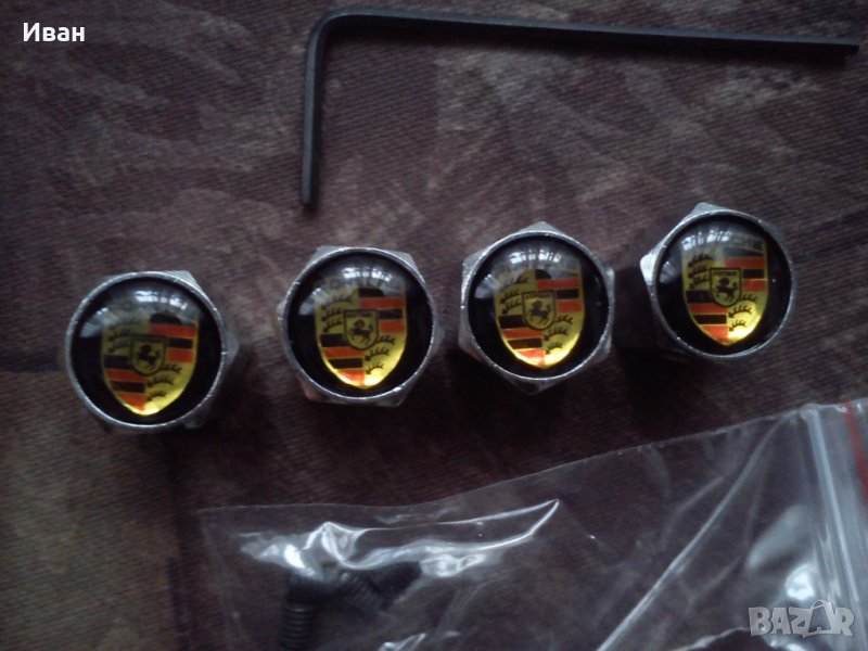 4. Шестограмни капачки за вентили, неръждаем метал, черни или сиви с цветни емблеми на Порше .