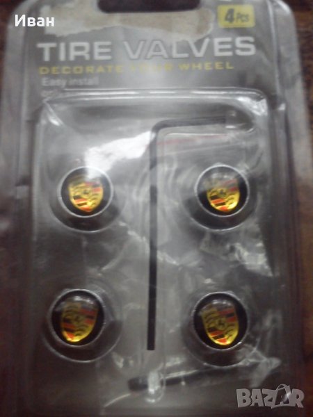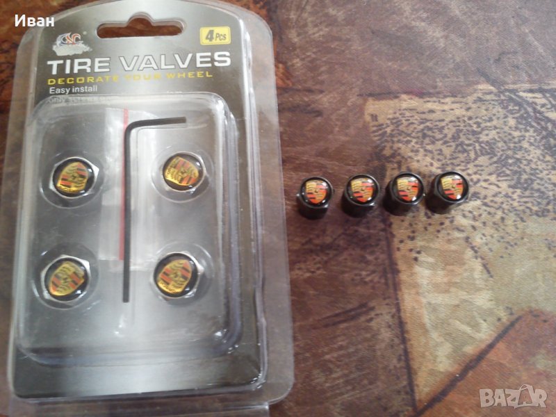 Имам и червени , сини , златисти и зелени капачки за вентили с цветни емблеми на Порше от този модел на цена 8 лв за 4 броя .