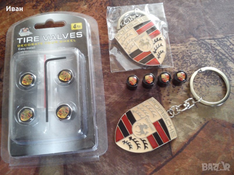 Продавам 3 вида ключодържател , капачки за вентили 3 вида , метални емблеми за ключ и 3Д силиконов самозалепващ стикер с цветна емблема и надпис Порше Porsche.