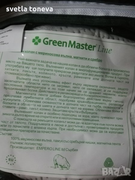 Многофункционален магнитен колан с мериносова вълна,магнити и сребро.Облекчава болки в различни части на тялото-рамо,лакти,колена.Защитава кръста и бъбреците.Облекчава сковаността в долната част на гърба,скованост и болки в областта на шията.Подобрява кръвообращението,релаксира мускулите