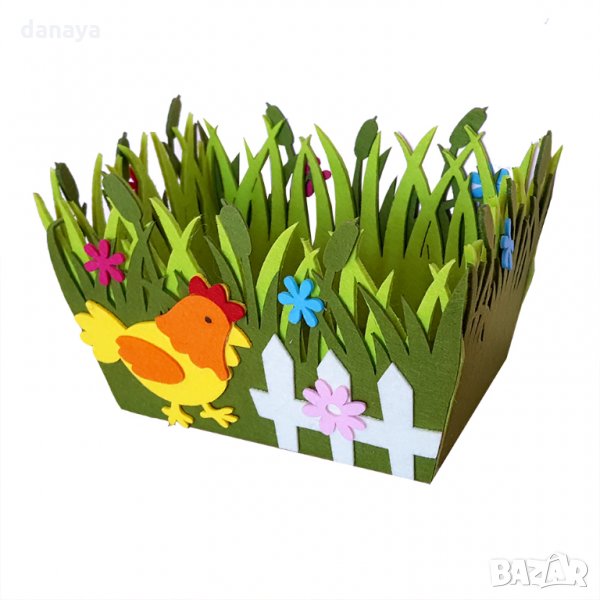 Великденски панер за яйца и лакомства. Великденска декорация за маса. Украса за Великден. Всеки великденски панер е изработен от филц. Лицевата част е украсена с кокошка, цветенца и ограда.