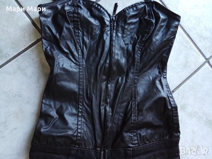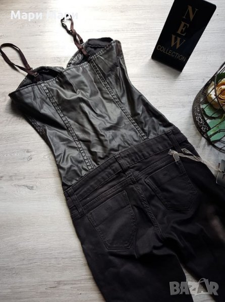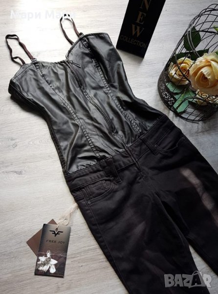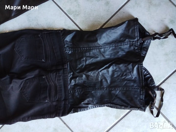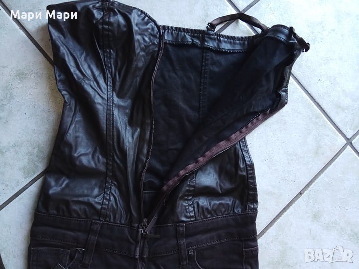 Гащеризон от еластияна материя. Панталон - памучна материя, горна част имитира мека кожа с цип, презрамките се коригират, както и свалят. Тъмно кафяво.