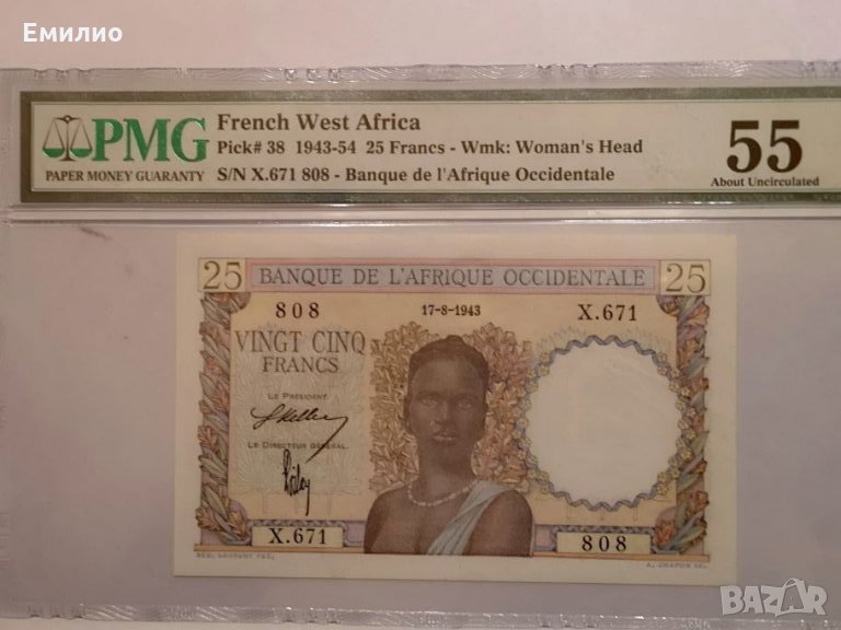 Rare French West Africa 25 Franks 1943 PMG AU 55 → Обява 24614482
