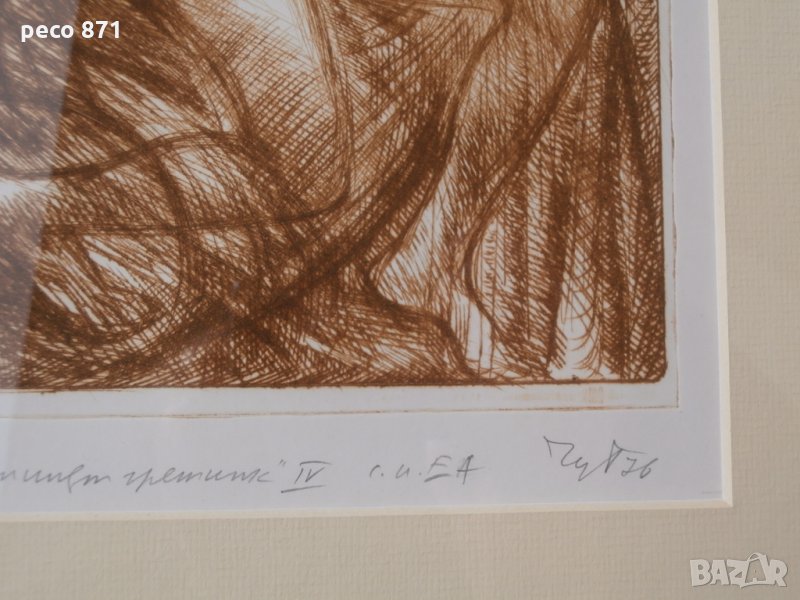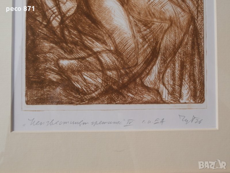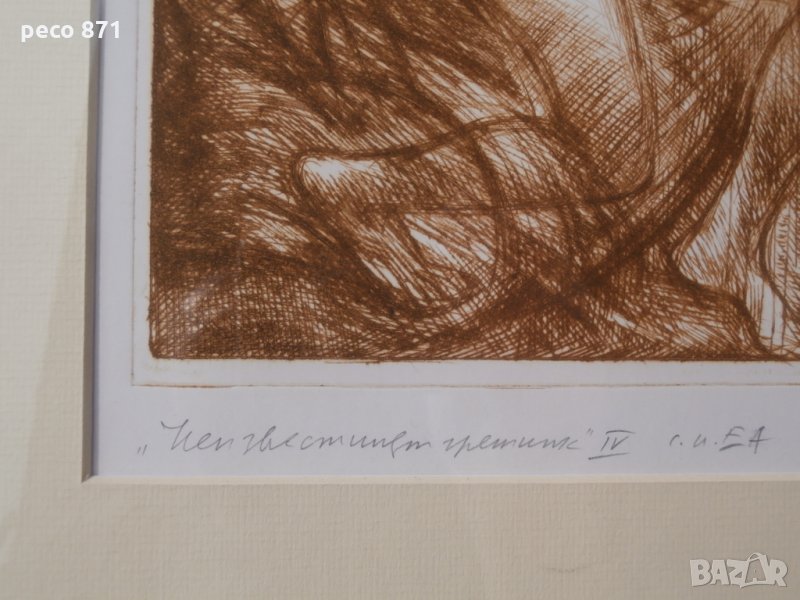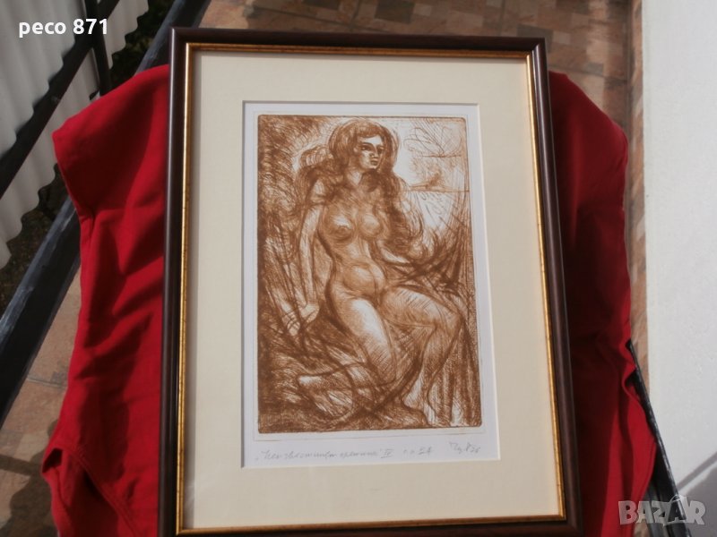 Състояние,по снимките.Предаване само на лична среща в София,района на Бъкстон или Руски паметник.Ако имате въпроси,пишете на лични.Състояние,по снимките и много-добро,отлично.Размери с рамката 35,7/27,3см.,без рамката 25/17см.Новорамкирана,с антирефлексно стъкло.Техника-Суха игла,авторски отпечатък.Петър Симеонов Чуховски/31,12,1922г.-1995/,художник, професор.Роден в село Хотница, Великотърновско. Женен, съпруга Райна, син Симеон. Завършва Художествена академия - София, Графика и илюстрация при проф. Илия Бешков, 1952. Преподавател в Художествената академия, асистент на проф. Илия Бешков по графика, илюстрация, оформление на книги, рисуване, композиция; преподава перспектива от 1952; професор. Участва в редица изложби у нас и в чужбина. Има 6 самостоятелни изложби. Автор на над 20 книги по проблеми на изобразителното изкуство, монографии за художници и др. Книги: "Иван Кьосев", 1971; "Рисунката", 1976; "Бойчо Григоров", 1976; "Петър Чуклев", 1977; "Никола Мирчев", 1978; "Михаил Петков", 1978; "Илия Бешков 1901-1958 Избрани творби", 1981; "Съвременно българско изобразително изкуство - живопис, графика, скулптура", в съавторство със Светлин Русев, 1982; "Лиляна Русева", 1985 и др. Ползва френски език. Починал.