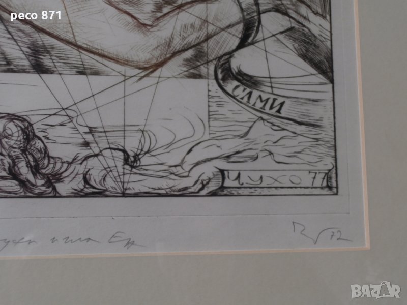 Състояние,по снимките.Предаване само на лична среща в София,района на Бъкстон или Руски паметник.Ако имате въпроси,пишете на лични.Състояние,по снимките и много-добро,отлично.Размери с рамката 48,5/43см.,без рамката 33/27см.Техника-Суха игла,авторски отпечатък.Петър Симеонов Чуховски/31,12,1922г.-1995/,художник, професор.Роден в село Хотница, Великотърновско. Женен, съпруга Райна, син Симеон. Завършва Художествена академия - София, Графика и илюстрация при проф. Илия Бешков, 1952. Преподавател в Художествената академия, асистент на проф. Илия Бешков по графика, илюстрация, оформление на книги, рисуване, композиция; преподава перспектива от 1952; професор. Участва в редица изложби у нас и в чужбина. Има 6 самостоятелни изложби. Автор на над 20 книги по проблеми на изобразителното изкуство, монографии за художници и др. Книги: "Иван Кьосев", 1971; "Рисунката", 1976; "Бойчо Григоров", 1976; "Петър Чуклев", 1977; "Никола Мирчев", 1978; "Михаил Петков", 1978; "Илия Бешков 1901-1958 Избрани творби", 1981; "Съвременно българско изобразително изкуство - живопис, графика, скулптура", в съавторство със Светлин Русев, 1982; "Лиляна Русева", 1985 и др. Ползва френски език. Починал.