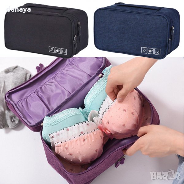 сутиени. Изключително удобен несесер за пътуване, с който бельото ще бъде подренено и винаги под ръка. Водонепропусклива и устойчива на износване материя. Голям капацитет - може да побере 4-6 сутиена, без да се мачкат. 4 еластични джоба за чорапи и бельо. Среден подвижен джоб за козметика и тоалетни принадлежности.