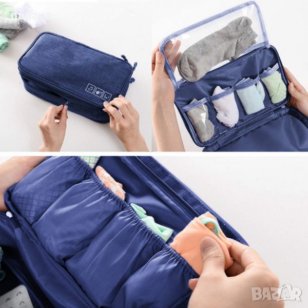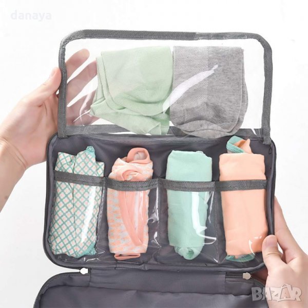 Мултифункционален органайзер за бельо. Несесер за бельо. Чанта за пътуване с отделения, затварящи се с цип. В две от преградите има вътрешни джобове за лесно съхранение на чорапи и бельо. Специално отделение за