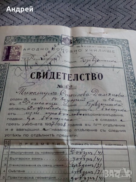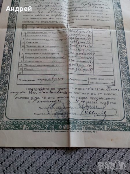 Свидетелство за завършено 4-то отделение 1938 → Обява 24632375