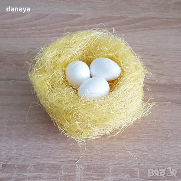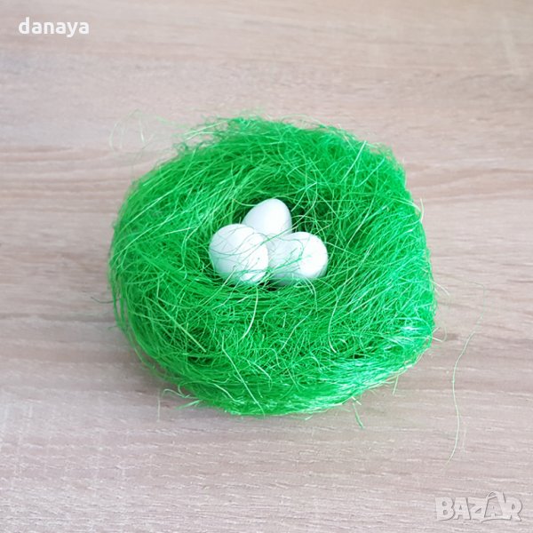 Великденска украса, гнездо с 3 яйца. Декоративна тревичка за декорация и украса на великденски панери. Предлага се в 4 цвята - оранжев, жълт, бял, зелен.