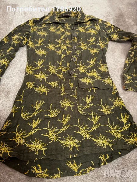 Стилна дамска риза на SKFK в тъмнозелен цвят с красиви жълти бродирани флорални мотиви. Ризата е дълга, подходяща за носене както с панталон, така и с пола.