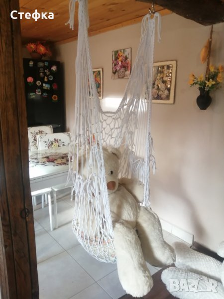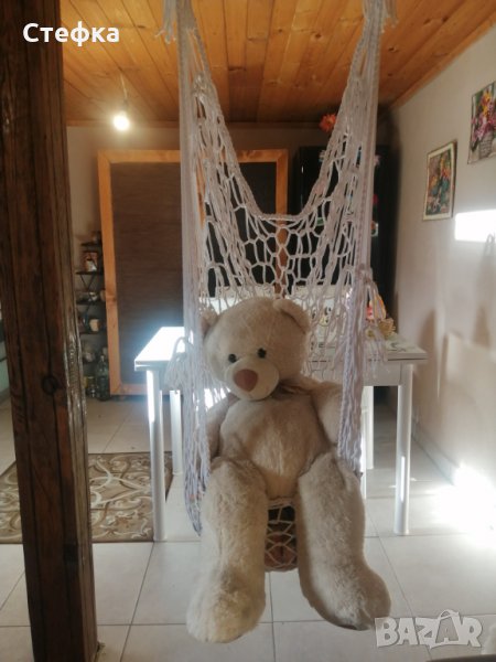 Ръчно плетена люлка,от памучно въже.Издържа над 100 кг. Мечето в нея е дълго 1 метър,не влиза в цената.Подходяща е за веранда,градина и стая.Цвета може да бъде и в сиво и бежево.Люлките се правят при потвърдена поръчка и изискват минимум 3 дена за изработката, в пролетно-летния сезон дори седмица.