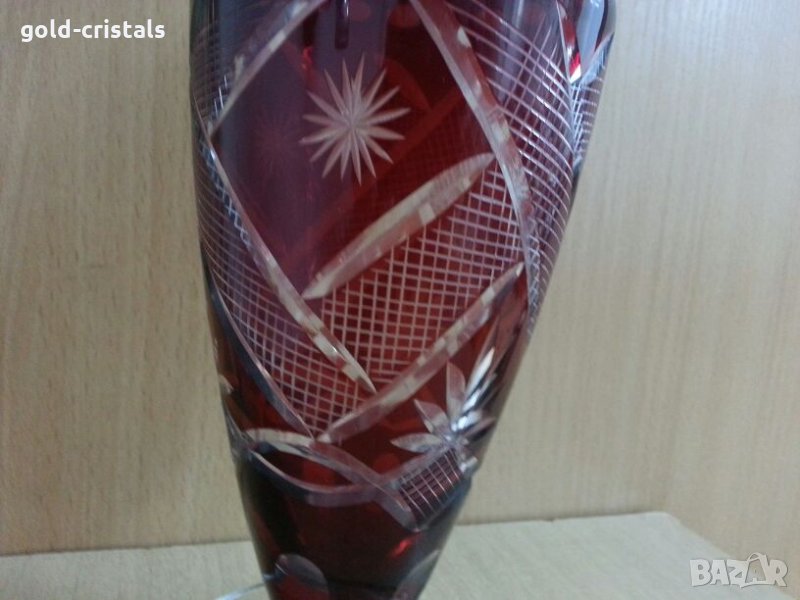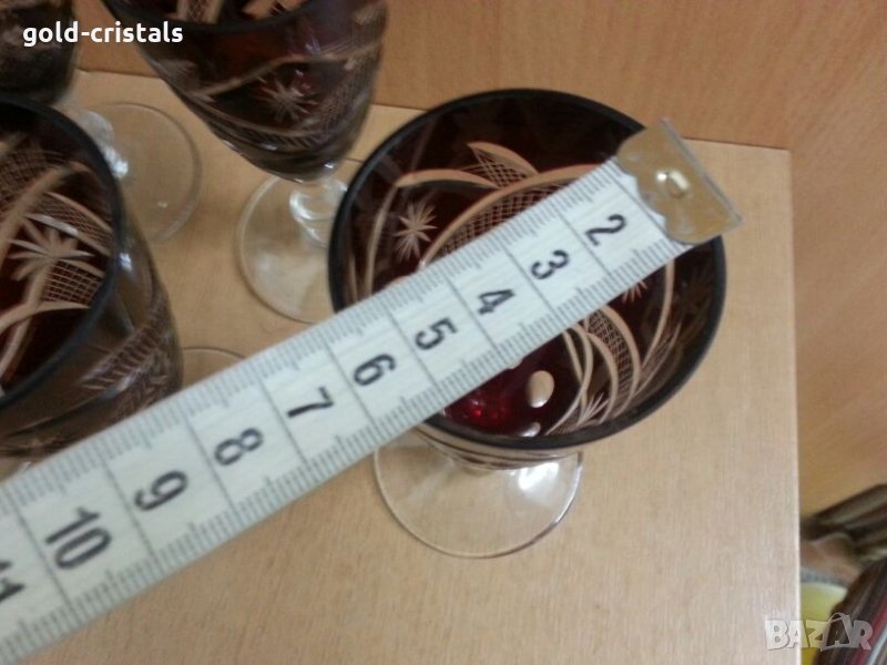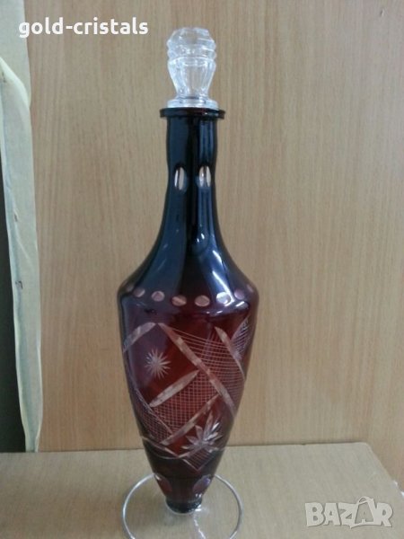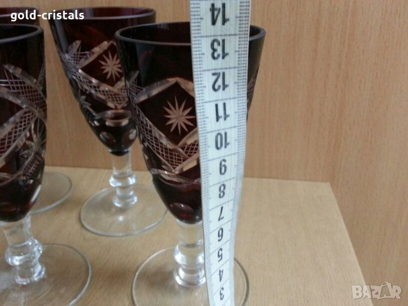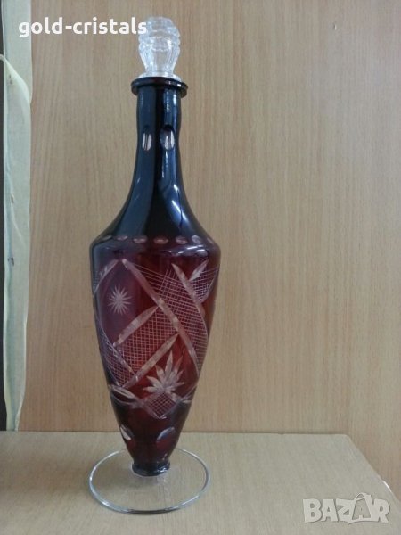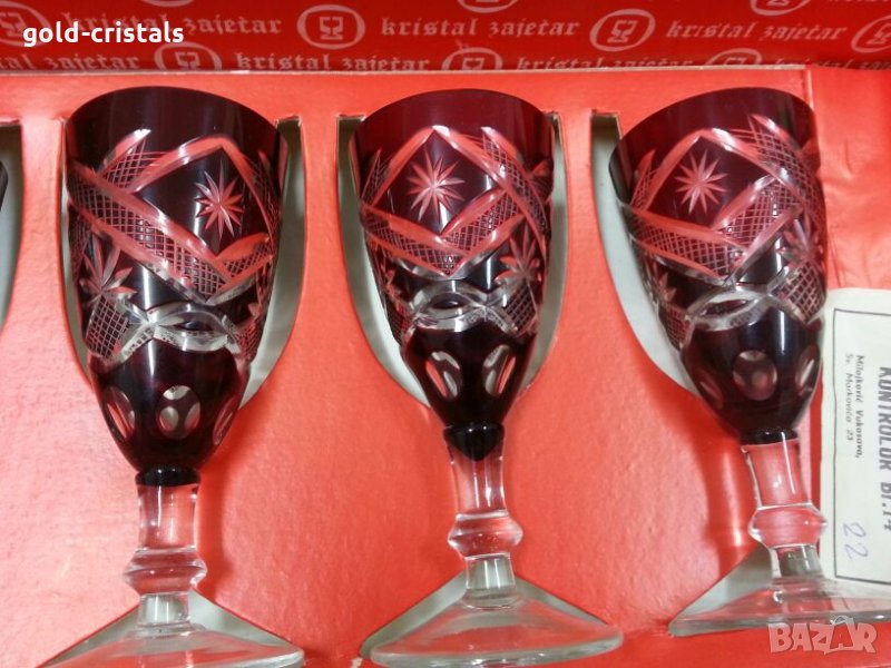 Сервиз кристални чаши цветен червен ръчно гравирани гравиран кристал нови в кутия 6бр -690лв чаши нови същите но без кутия 6бр-590 лв и кристална гарафа -140лв комплект сет лот ретро стари арт декор винтидж колекция стари старинни антикварни предмети обзавеждане за дома и семейството подходящи за подарък за ценители и колекционери цветно червено стъкло ръчно гравирани бутилка шише стъклена тапа