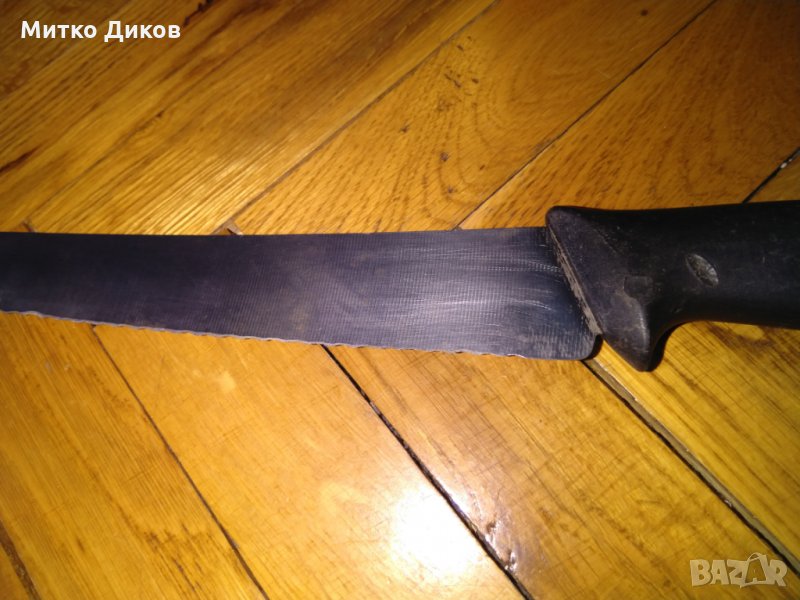 Ножът е с размер 392мм обща дължина и на острието -252мм което е назъбено за рязане на хляб-става и за други неща-изпращам по еконт с отстъпка