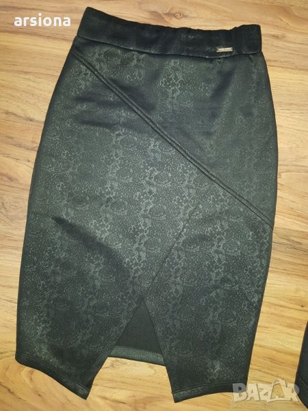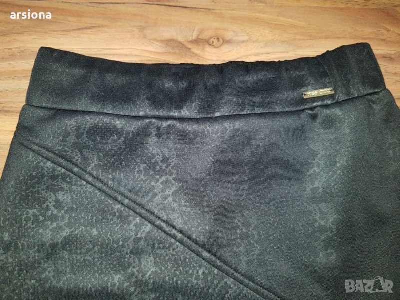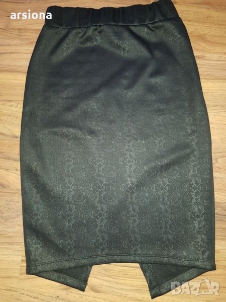 Красива пола, размер Л, но тъй като е еластична става и за М. Отпред е с цепка, която стои много ефектно. На талията е с ластик. Дължината е до коляното.