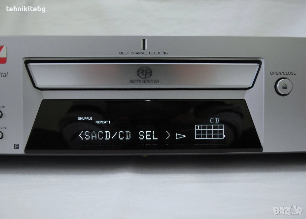 Жесток CD/SACD Супер Аудио плеър , чете дисковете мигновено . Многоканално стерео - възможност за слушане на качествена музика в 5.1 канален звук . Механизъм KHM-234AMA , 2Hz - 20KHz , 98dB (CD) , 103dB (SACD) , THD: 0.0025% (CD) , 0.002% (SACD) , сериозна електроника под капака с качествени елементи и голям траф . Тегло 3.9 кг. Инструкция в PDF формат . Възможност за дистанционно . Има няколко леки забележки на панела от пред и повече на капака от горе . Цена като нов във Великобритания 400 паунда . Цената е съобразена със забележките . Лично внесен от Англия .