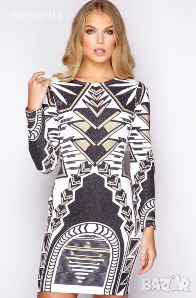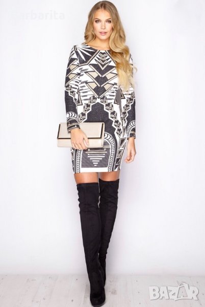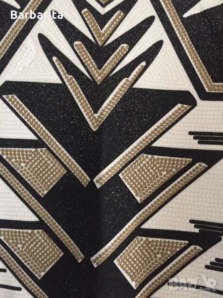 Дамска рокля с ацтекски принт в черно,бяло и златно.Размер 38/М,дължина - 86см.Материя -полиестер -95%,еластан -5%.