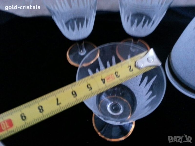 Ретро стъклени чаши и гарафа 7бр чаши и гарафа шише бутилка с златни кантове позлата не изполван без забележки комплект сет лот стар старинен антикварен арт декор винтидж чаши на столче позлата гравюра бутилка шише стъклена тапа запушалка капачка колекция стари антикварни предмети обзавеждане за дома и семейството подходящи за подарък за ценители и колекционери