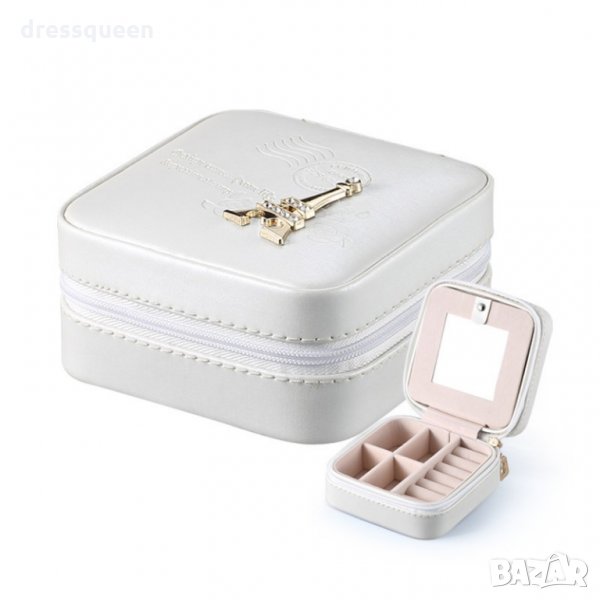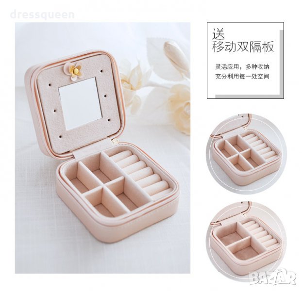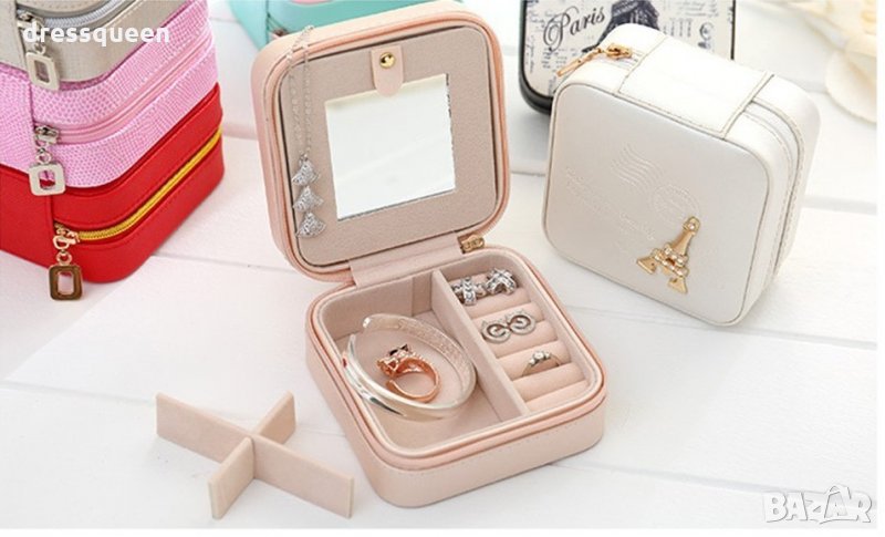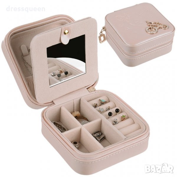 Компактна кутия за съхранение на бижута с огледалце и различни отделения. Малките и размери я правят изключително удобна при пътуване. Зад огледалцето има второ отделение.