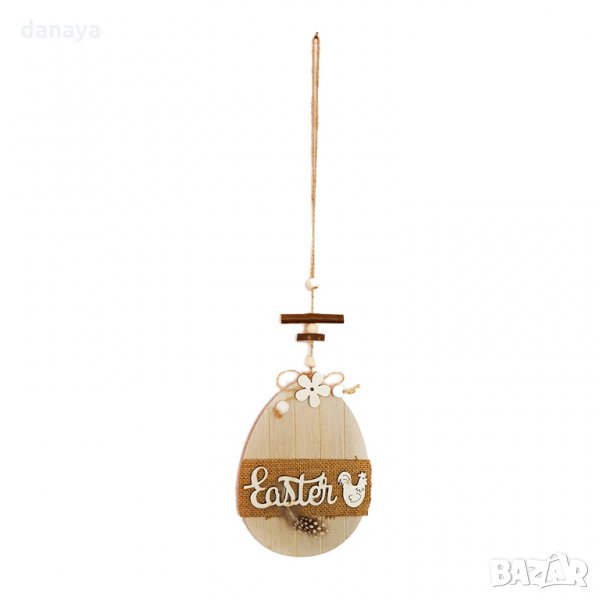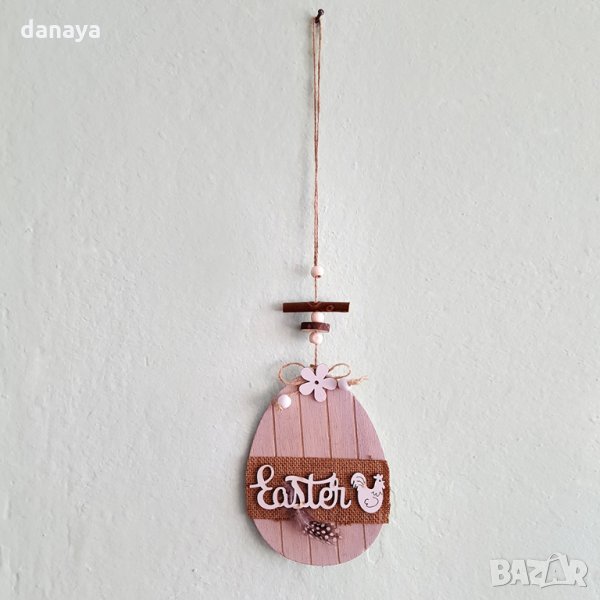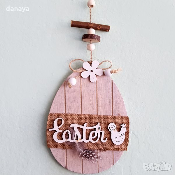 Великденска украса за стена. Висулка с форма на яйце и надпис Easter. Към великденското яйце са добавени допълнителни елементи от дърво и плат, за да придобие наистина елегантен и красив вид. Дълга връвка за закачане. Височина само на дървеното яйце: 15см