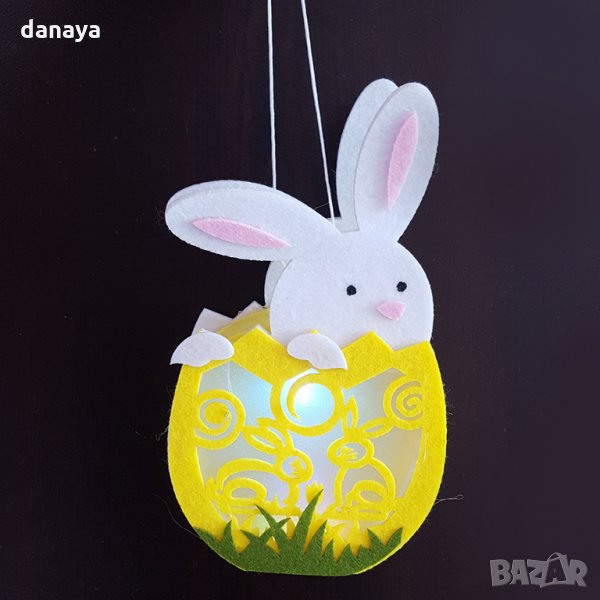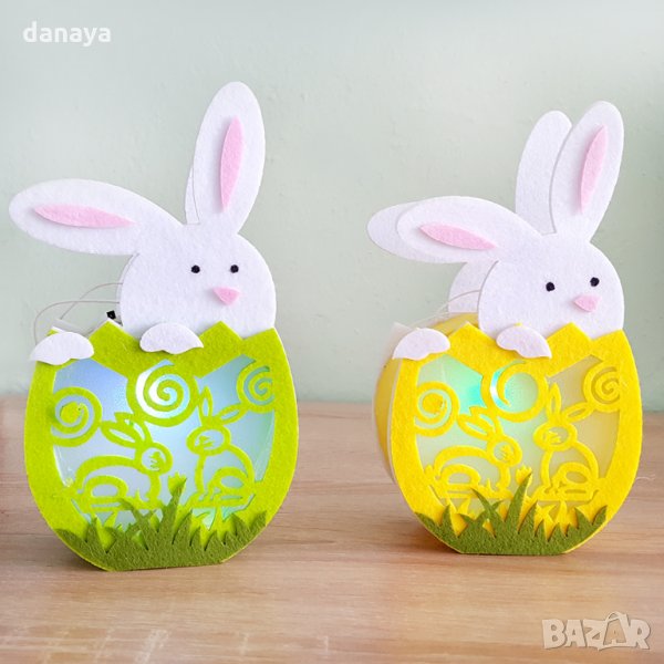 Светещо великденско зайче с възможност за закачане на стена. Великденски заек, който свети в преливащи цветни светлини. Красива декорация за Великден. С копче за включване и изключване. Батериите са включени в комлекта. Зайчето е изработено от филц. Предлага се в два цвята - зелен и жълт. Размери: 10x18см. С две лицеви страни.