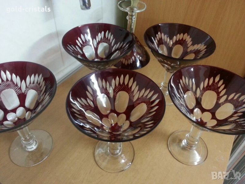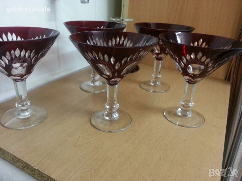 Кристални чаши 5бр шестата е подарък с забележка може да се ползва като свещник или по предназначение цветен червен кристал рубинено червен ръчно гравиран кристално стъкло сервиз комплект сет лот ретро арт декор винтидж колекция стари старинни антикварни предмети обзавеждане за дома и семейството подходящи за подарък за ценители и колекционери руски кристал съветски ссср чаши на столче
