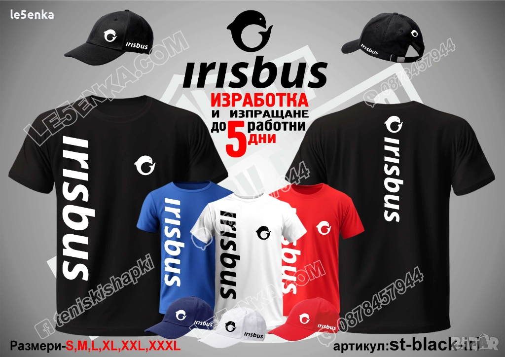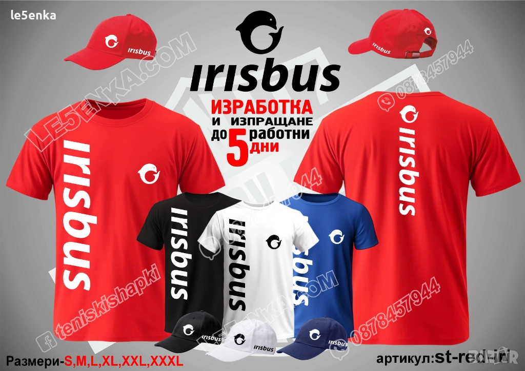 Посочената цена е за шапка и тениска комплект. Само шапка - 18 лв. ,а само тениска - 32 лв. Тениските са изработени от качествена памучна материя - различна номерация и цветове - черен, син, червен и бял. Шапките са памучни с метален клипс или коланче за регулиране - тип бейсболни. Последната снимка в обявата е на таблица с размери за тениските. Изпращаме по Еконт.