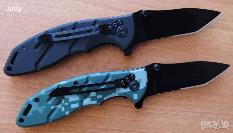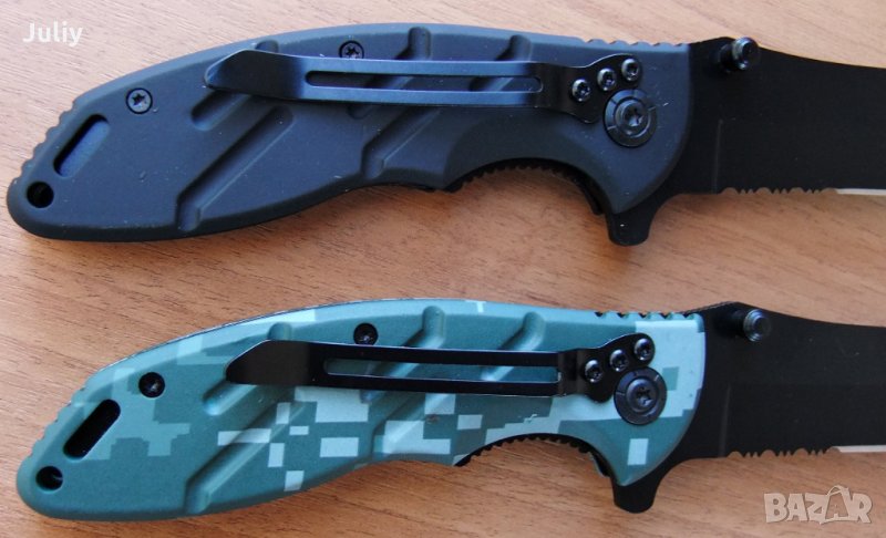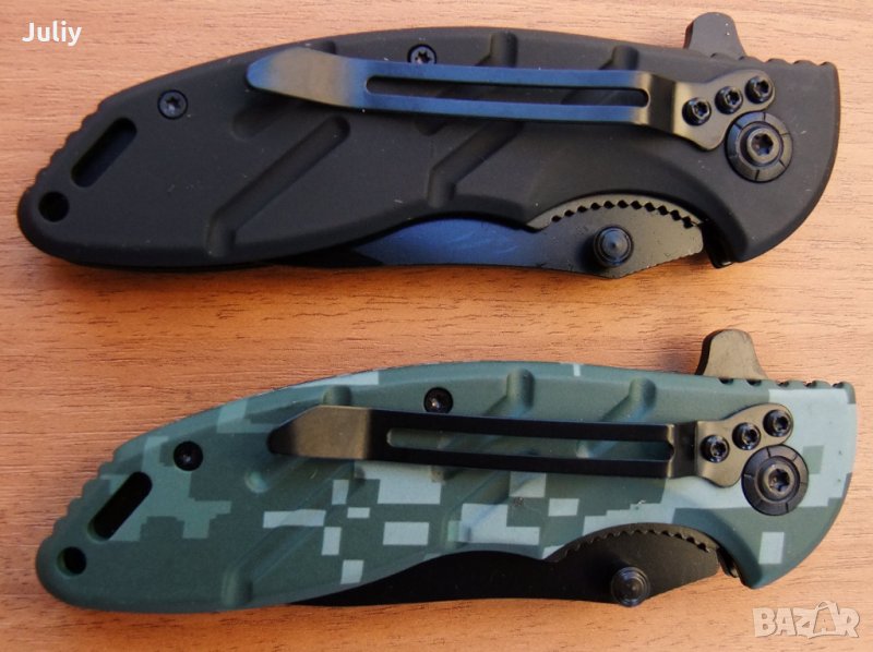 Сгъваем нож със асистирано отваряне /отваряне с един пръст с натиск върху щифта. Цвят: камуфлажен и черен.