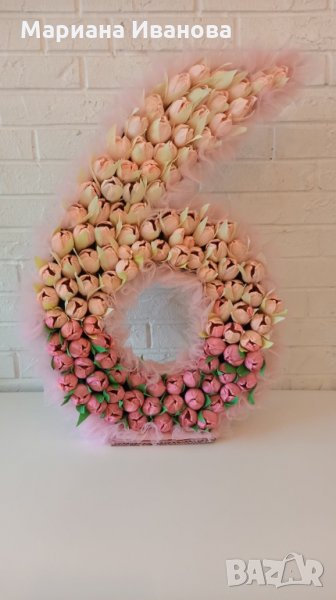Изработвам обемни големи цифри и букви за всякакви поводи: кръщене, рожден и имен ден, юбилей, за деца и възрастни. Цифрата е декорирана с цветя, изработени от крепована хартия, пълни с шоколадови бонбони. Цветовете - по желание на клиента.