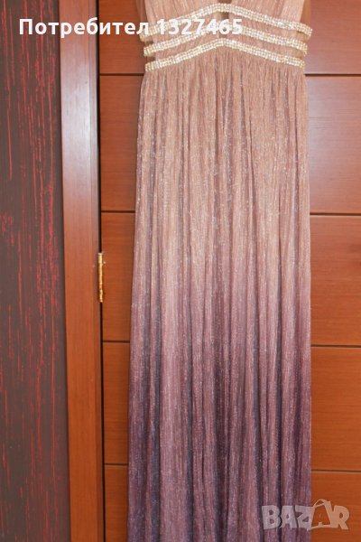 Официална рокля на водещ български бранд, подходяща за абитуриентка.Цвят много светло лилав преливащ по дължината към по тъмно лилаво.Талията изцяло от камъни.Без ръкави.Дължина 155 см.талия 33 см..В отлично състояние.Един път обличана. Има и калъф с логото на фирмата.