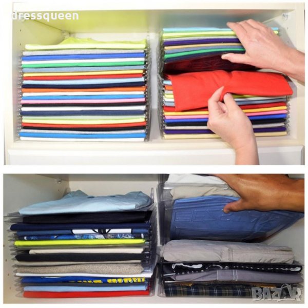 На всеки се е случвало - идеално подреден гардероб, и когато решите да си вземете нова тениска, любимата ви се оказва в средата на купчината, дръпвате я и цялата подреденост отива на кино. За да не подреждате и сгъвате всеки ден, вземете този простичък но уникално ефективен органайзер! Състои се от десет части, влизащи една в друга, които поддържат тениските ви идеално сгънати и подредени дори когато си вземете една от средата! Супер практичен, удобен, за подреден и организиран гардероб и освен това е идеален за пътуване! Просто вземате купчината и слагате в куфара! Дори децата се справят чудесно с подреждането! Сложете край на разхвърляните и набутани безразборно дрехи в гардероба!