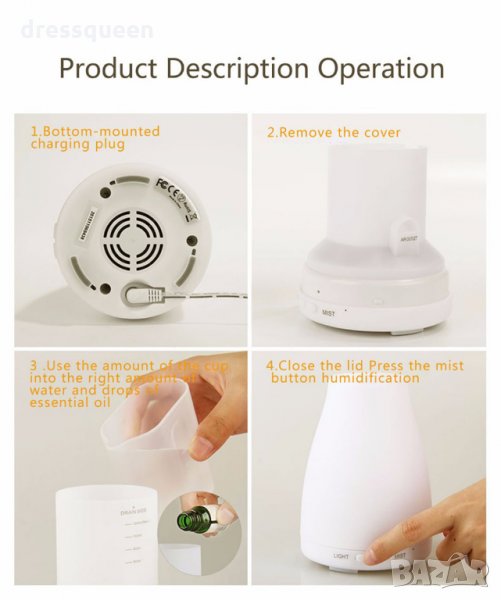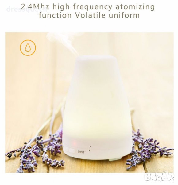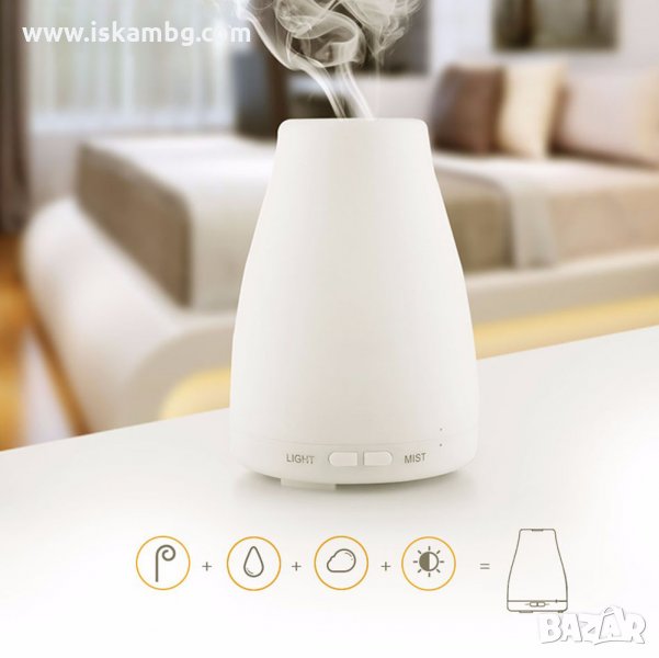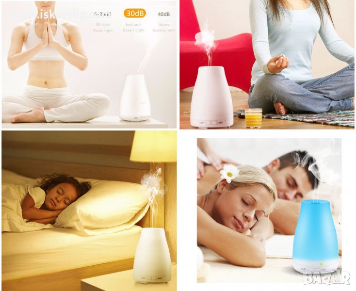 Мултифункционален дифузер - Служи едновременно, като дифузер за ароматерапия, овлажнител на въздуха и като нощна лампа. Има 7 цвята, като може да си изберете само един или да се редуват, което създава приятна атмосфера във вашата спалня през нощта.