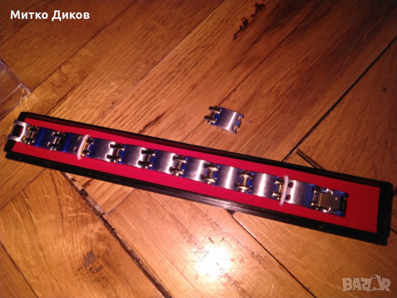 Верижката е стоманена чисто нова в кутийка с размер 194мм и допълнително звено-има надпис на латиница станлес стийл който се вижда на фотосите-изпращам по еконт с отстъпка