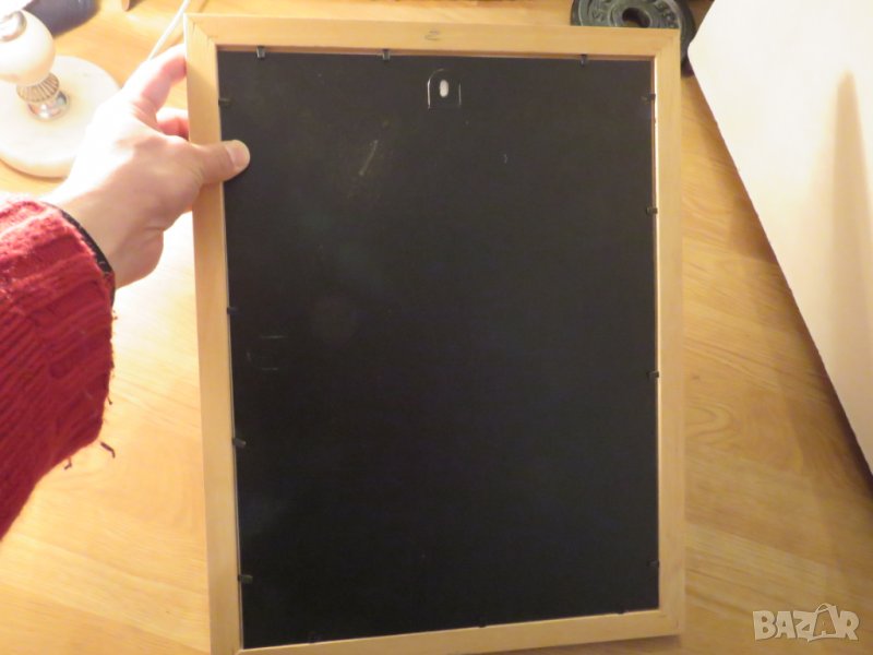Картината е с дървена рамка, покрита със стъкло и кукичка за закачане на гърба