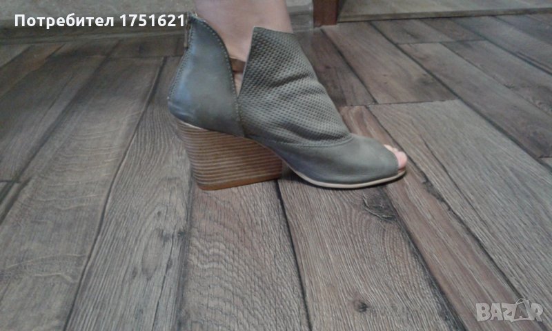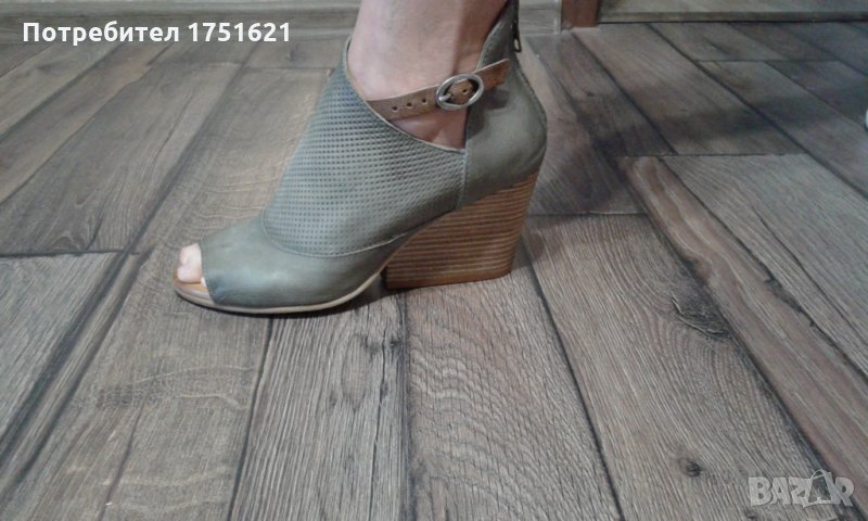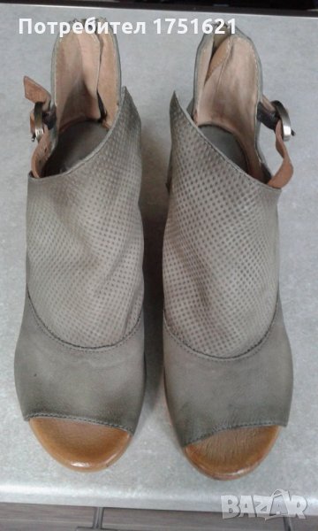 Сандалите са купувани от Италия. Кожена горна част с регулируема каишка за различни ширини на глезена. Задния цип осигурява лесно обуване и събуване. Тока е дървен с височина 8 см.