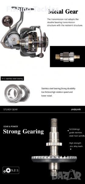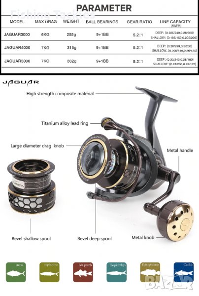 - JAGUAR2000 | тегло: 249g | пред. число: 5.2:1 | лагери: 9+1BB | Max Drag: 6KG | капацитет влакно (mm-M): Дълбока 0.205/240 , 0.26/160, Плитка 0.165/120 , 0.185/100