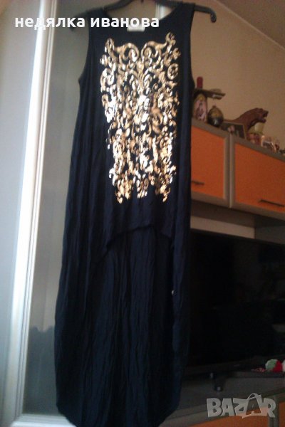 Чисто нова туника,наситено черен цвят,златни орнаменти отпред.Предната част е къса-60см.,отзад е дълга,дължина-112 см.