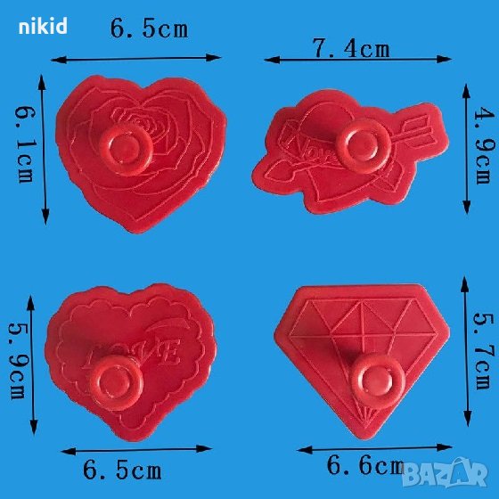 Сърце Роза Love стрела диамант 4 пластмасови релефни резци форми с бутало за тесто фондан сладки → Обява 24874370
