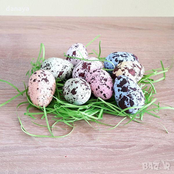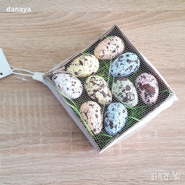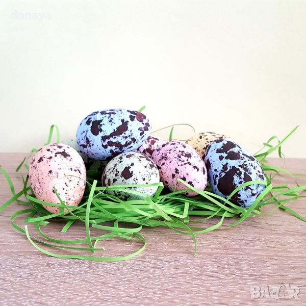 Шарени великденски яйца с тревичка в картонена кутийка. Всеки комплект съдържа 9 броя шарени яйца и зелена тревичка. Красива декорация за Великден. Яйцата са изработени от стериопор.