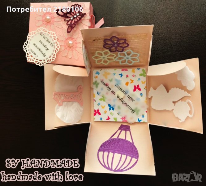 Експлодираща кутия - подарък за гости за рожденния ден и кръщене. Срока за изработка зависи от количеството. Може да поръчате и индивидуална кутийка, която вие да подарите. В средата има възможност за поставяне на ваш текст. За повече подробности се свържете с мен.