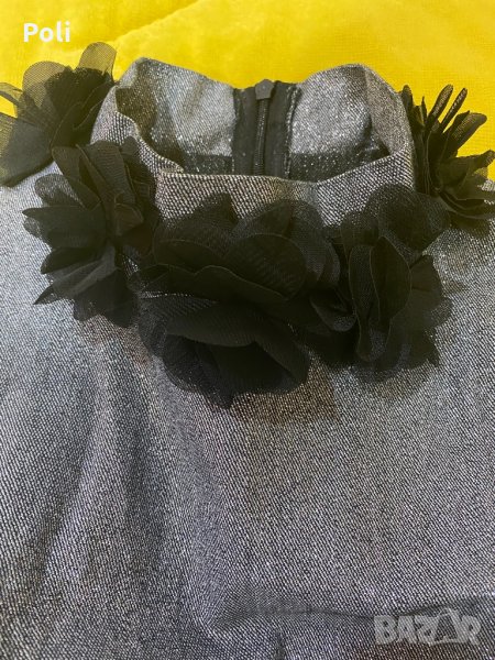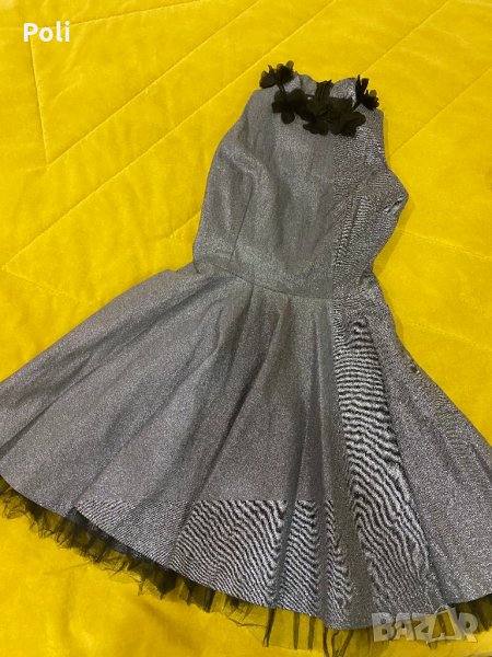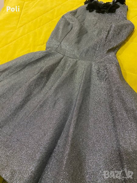 Красива рокля в металическо сиво с 3D цветя около врата. Никога не е обличана.