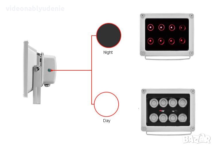 Пoддържа спомагателно осветление за нощното виждане на камерите за видеонаблюдение на разстояние 55 метра.