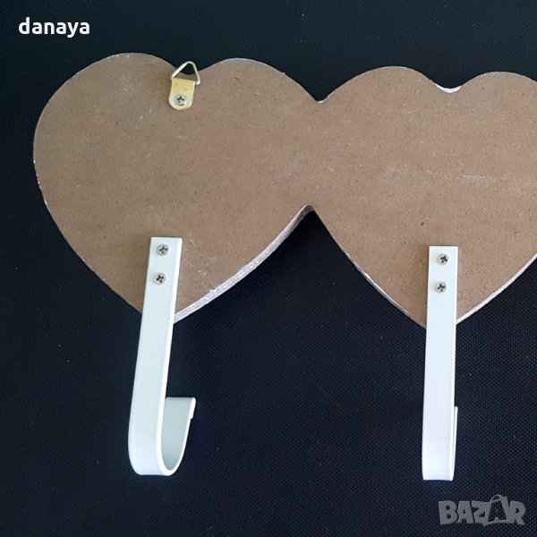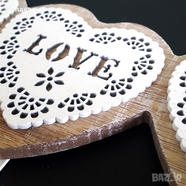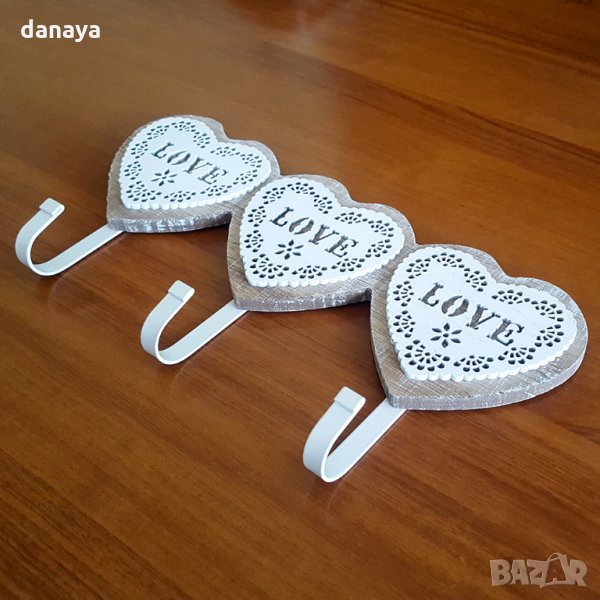 Декоративна дървена стенна закачалка за дрехи, аксесоари или ключове. Закачалката е с форма на три съца, върху всяко сърце има надпис LOVE. Модерен дизайн. Красива декорация за дом или офис. Чудесен подарък за нов дом.