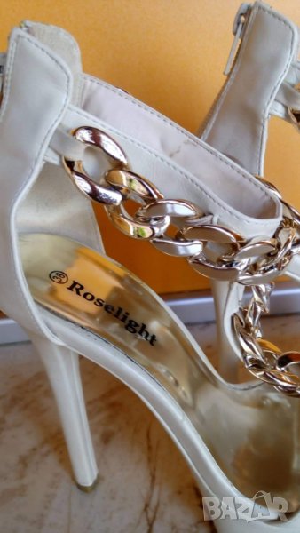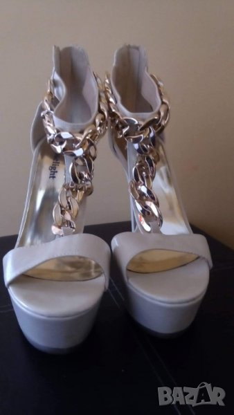 Елегантни сандали на висок ток със златиста верижка, която ги прави още по-официални. Подходящи за за абитуриентски бал, сватба, дискотека и т.н.