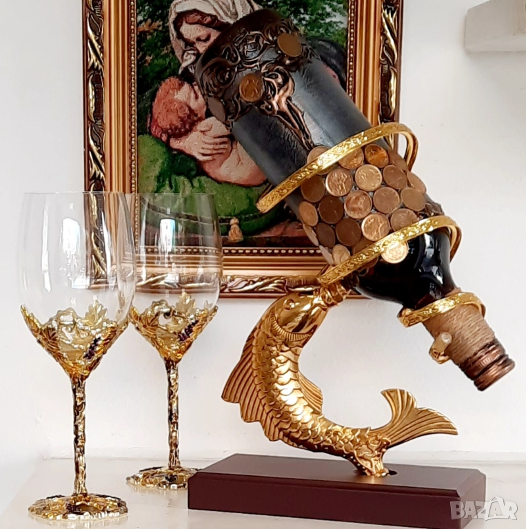 Златна поставка за бутилки - Риба от месинг и махагон с авторска бутилка с монети Дървото на живота или декорирана с кожа във формата на торбичка и дървена плочка с пожелание Честит Празник, Честит рожден ден, Честит имен ден или Честит юбилей.
