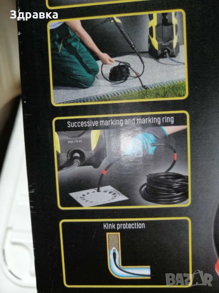 Непрекъснатият маркер по цялата дължина - 15 m, показва напредъка в тръбата. Маркучът е гъвкав и подсилен с метална нишка, накрая завършва с месингова дюза с дупки. Притежава адаптор ,накрайник ,които е съвместим с водоструйки "КЕРХЕР" и много други . Подходящ, както в закрити помещения, бани,тоалетни кухни ,така и на открито в двора и градината .