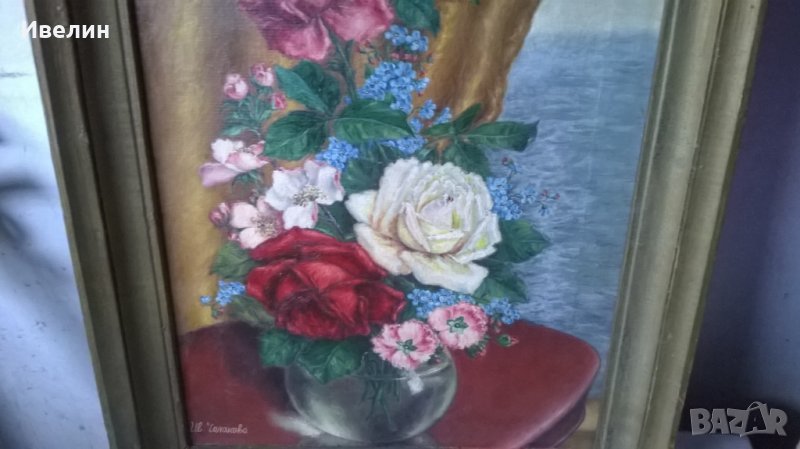 картина-цветя.масло на платно,подписана на подрамка с размери 38см/34см,в рамка с размери 66см/50см
