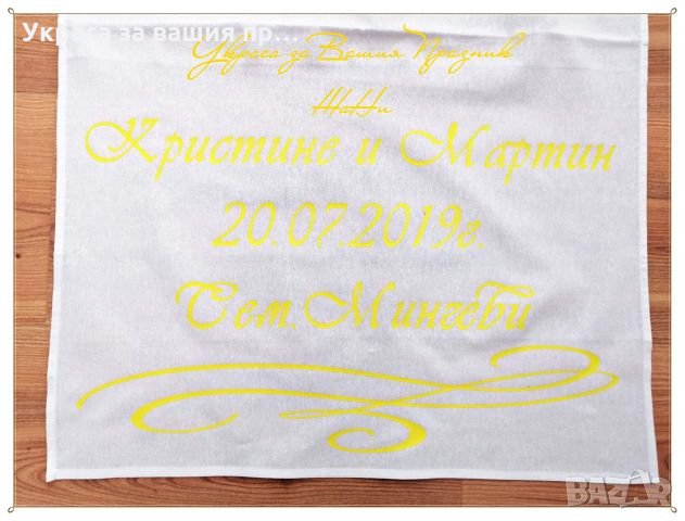 Платно за сватба с имената на младоженците и Датата за влизане в ресторанта при ритането на менчето