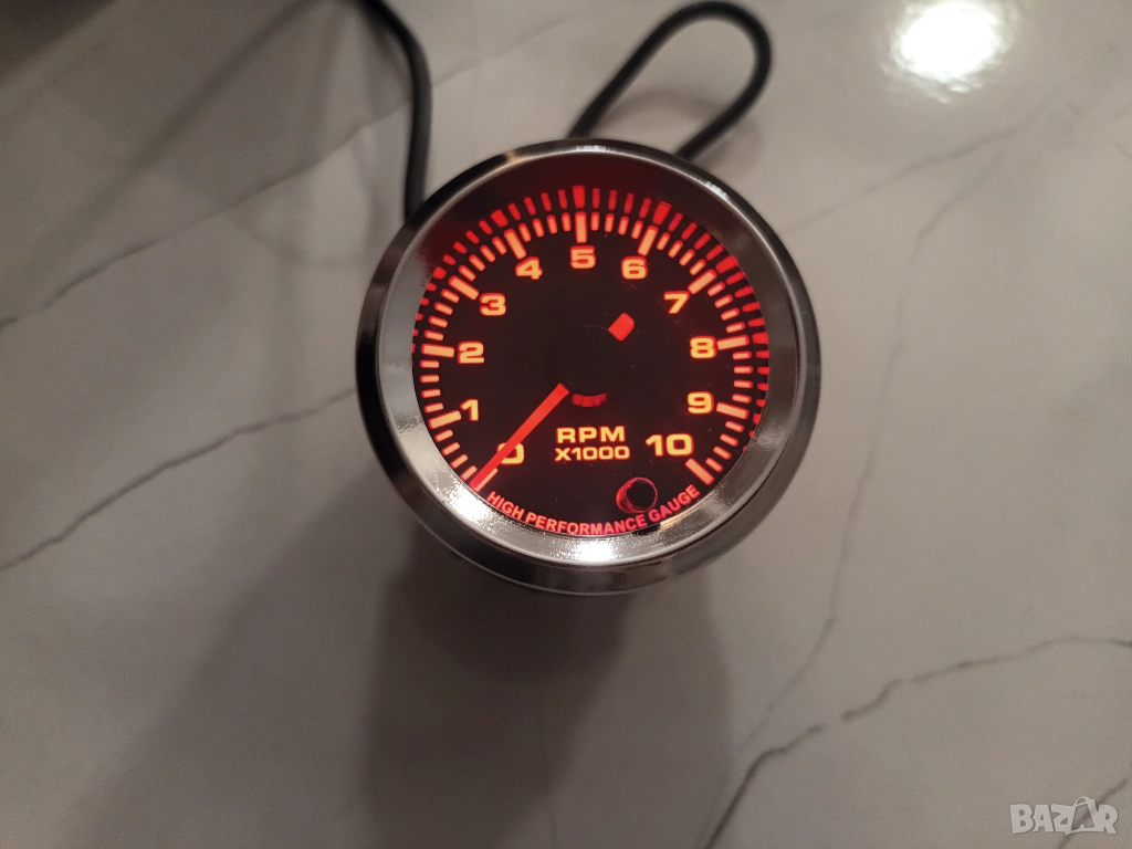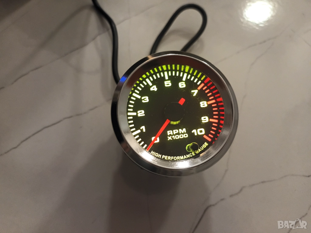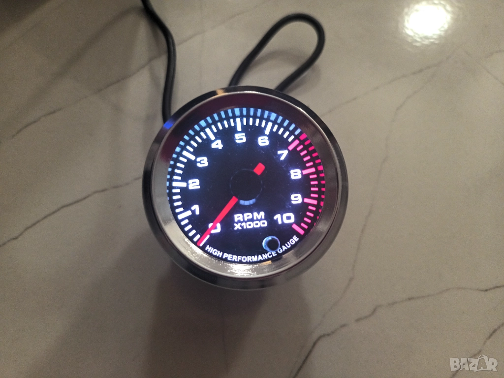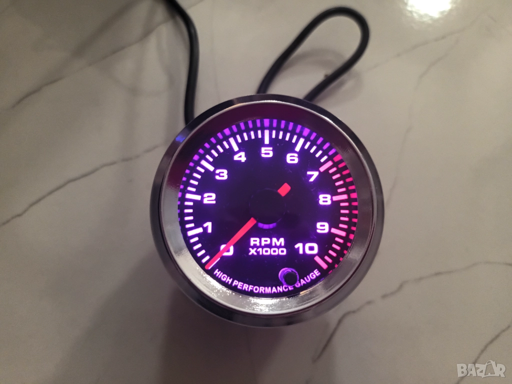 Продавам аналогов (със стрелка) обортомер със сребърен пръстен във външната част на уреда, измерва от 0 - 10 000 оборота. Свети в седем цвята – по избор. Уредът прави тест на стрелката при стартиране. Стрелката се движи много плавно и измерва много точно. Диаметъра на обортомера е 52мм. Подходящ е за 4, 6 и 8 цилиндрови двигатели, като има копче на гърба на уреда с което се превключват броя на цилиндрите според автомобилът, на който ще бъде монтиран. Компактният му размер е подходящ за монтиране и на мотоциклети. Включени инструкции за употреба. Уреда е изключително точен. Лесен за монтаж. Снимки 1, 2, 3, 4, 5, 6, 7 и 8.